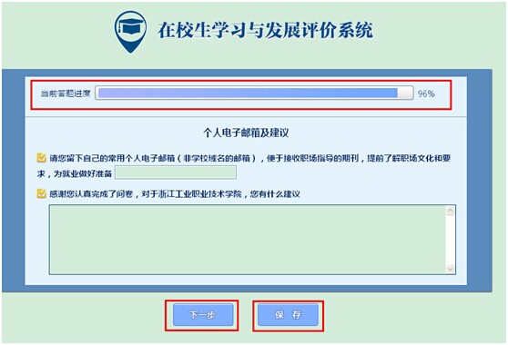 3.每个答题页面最下方,均有“下一步”,及“保存”按钮;回答完当前页面的所有题目之后,点击“下一步”进入下一个页面继续答题;若当前页面还有题目没有回答完,会弹出一个提示,提醒补答题目才能到下一个页面回答问题;点击“保存”,即可保存当前答题进度和答题数据。【如上截图所示】