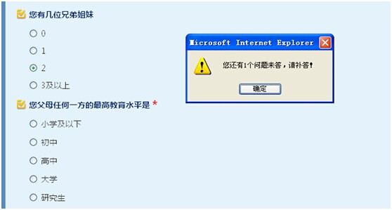 5.在校生问卷,所有的问题均为“必答题”,不能跳过不回答。若有未回答的题目,点击“下一步”,会提示未回答的数量,并在未回答题目最后有一个红色的“*”标记。【如下截图所示】